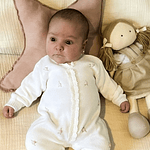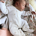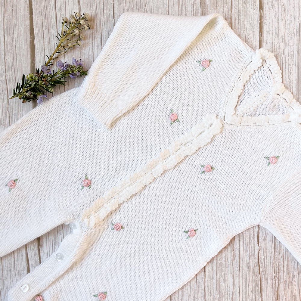 Enterito tejido en algodón pima con bordados de flores hechos a mano.