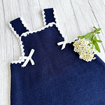 Traje tejido con bordes en crochet blanco y cintitas a los lados.