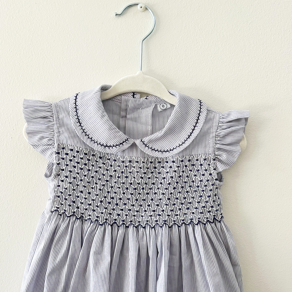 Clásico vestido de tela listada con bordados punto smock y puntitos bordados azul marino hechos a mano. Cuello también bordado, un vestido muy elegante para ocasiones especiales y lucir preciosa.
